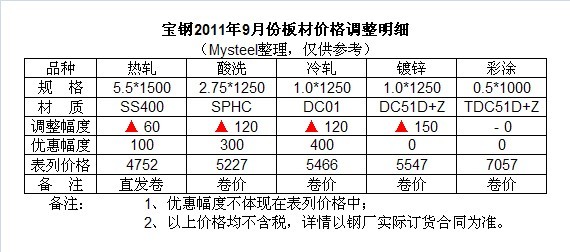 表一:2011年9月寶鋼主流板材品種價格調整明細